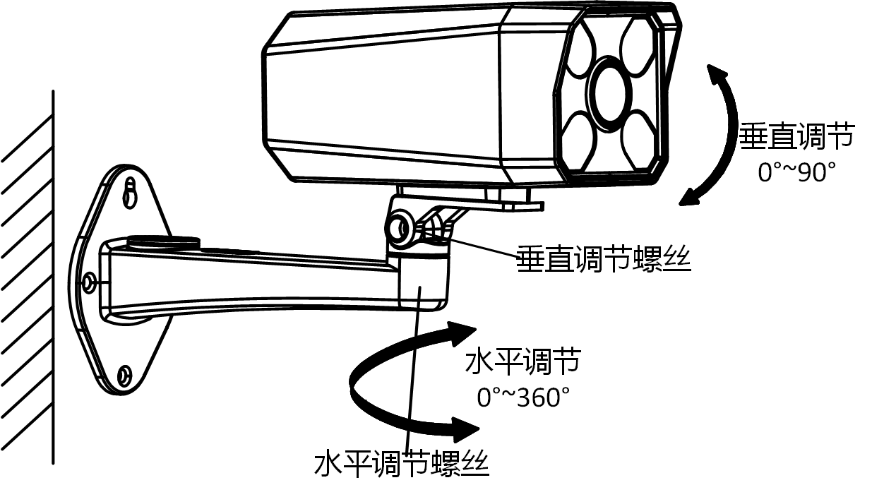 拧松垂直和水平调节螺丝,可调整垂直和水平方向的视角,将摄像机调整至所需监控的场景,拧紧调节螺丝固定,完成安装。